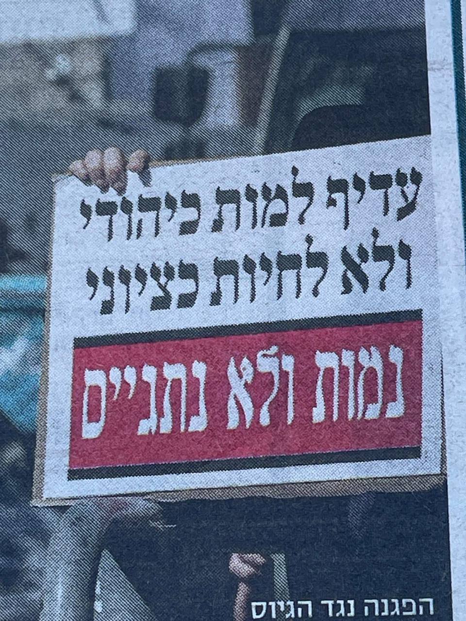 На плакате: "Лучше умереть евреем, чем жить сионистом. Умрем, но не пойдем в армию".
