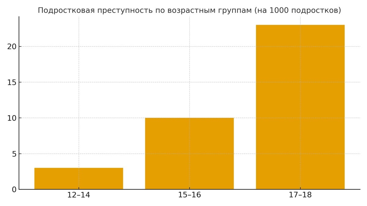 Самые опасные годы — старшие классы. В группе 17–18 лет доля подростков, подозреваемых в преступлениях, достигает 23 на тысячу, что почти в восемь раз больше, чем у учеников младших классов.