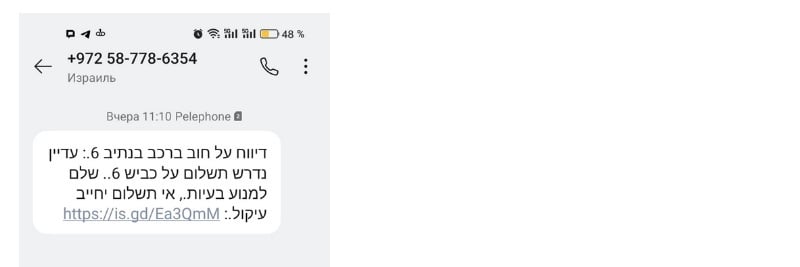 чет о задолженности по транспорту на пути №6: все еще требуется платеж за шоссе №6. Заплатите во избежание проблем. Неуплата повлечет арест имущества", - говорится в "эсэмэске", написанной нехарактерными для Израиля терминами и стилем.