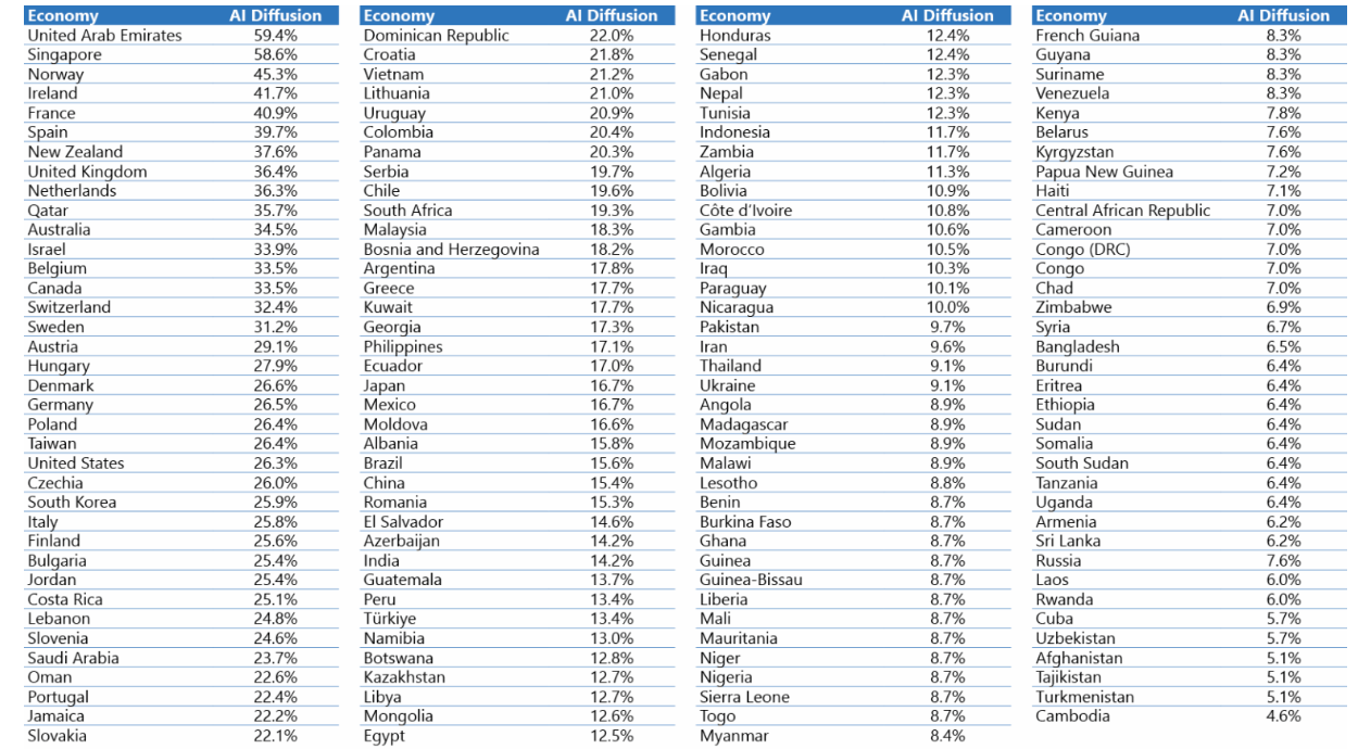 Отмечается, что искусственный интеллект — это технология, которая распространяется быстрее всего в истории человечества. С момента появления ИИ, менее чем за три года, его инструментами воспользовались более 1,2 миллиарда человек, что превышает темпы внедрения Интернета, компьютеров и даже смартфонов. Однако пока эта технология распространяется по миру неравномерно.