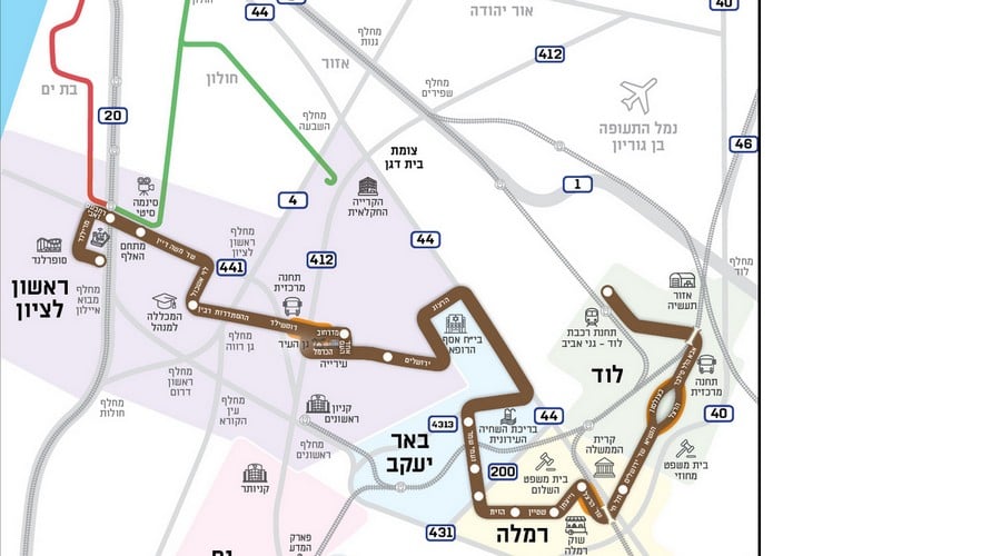 Коричневая линия "Метронита" будет начинаться в Лоде рядом с железнодорожной станцией "Ганей-Авив". Она пройдет через Рамле, Беэр-Яаков, Црифин и весь Ришон ле-Цион – через центр города по проспекту Моше Даяна в направлении моря и заканчивать маршрут около "Синема-Сити" и "Суперленда".