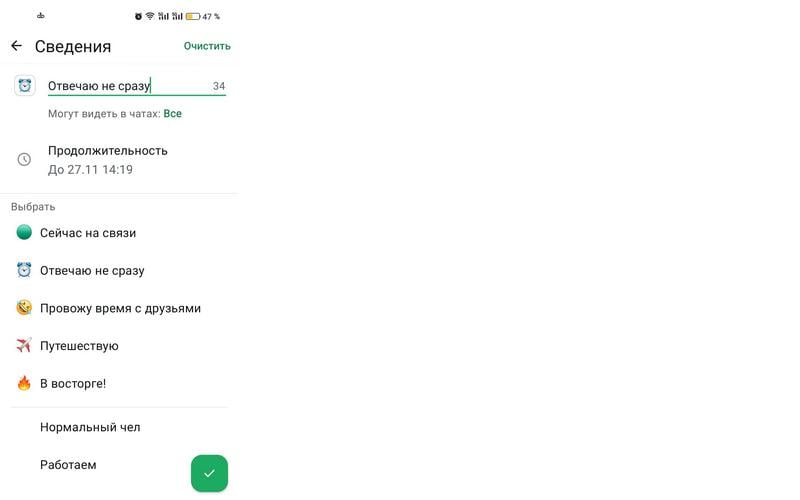 В предустановленных статусах имеются варианты типа "сейчас на связи", "отвечаю не сразу", "путешествую". Это напоминает статусы, которые в свое время присутствовали в "месенджере" ICQ вкупе с зелеными, красными и другими отметками.