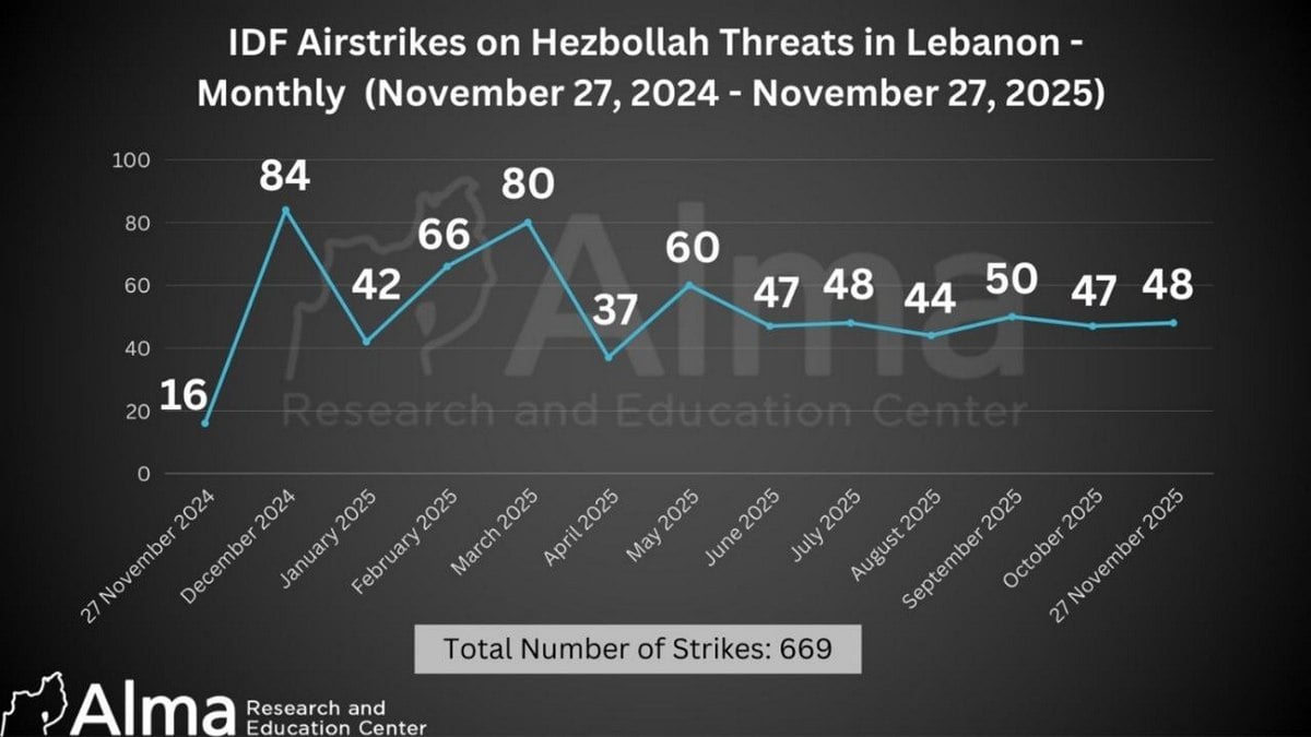 По данным "Альмы", с начала действия режима прекращения огня Армия обороны Израиля совершила 669 атак на объекты "Хизбаллы" в Ливане. Это произошло в ответ на нарушения со стороны группировки - создание тренировочных баз, размещение складов с оружием и ракетами, а также ракетных установок.