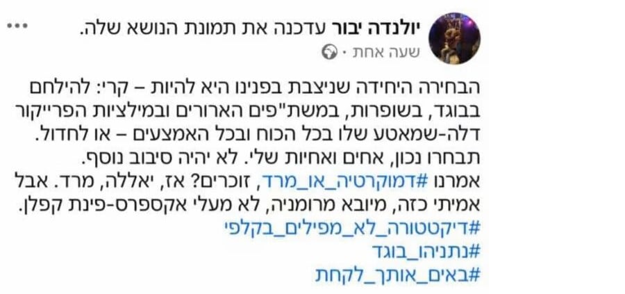 Чтобы было яснее, о чем речь, она сопроводила эту запись "хештегами" типа "Нетаниягу – изменник", "диктатуру свергают не на выборах", "мы идем за тобой".