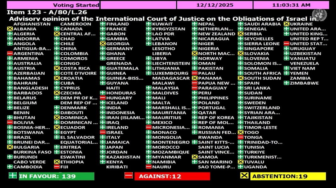 Резолюцию утвердили 139 голосами при 12 против и 19 воздержавшихся. Против, кроме Израиля, проголосовали Аргентина, Фиджи, Боливия, Венгрия, Папуа – Новая Гвинея, Микронезия, Науру, Парагвай, США.