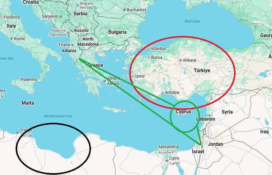 Итак, Израиль, Греция и Кипр объявили о создании военного альянса. Официально как бы против неких “угроз в Средиземноморье”, но угроза тут одна, и она хорошо известная, называется Турция. Чье влияние и распространение в Восточном Средиземноморье стало сильно осложнять трем странам жизнь и мешать. С тех пор как турки получили базы в Ливии, почти все Восточное Средиземноморье оказалось под их контролем.