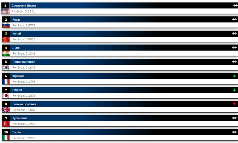 На первом месте оказались США — они находятся на этой позиции с 2005 года, когда был впервые создан этот рейтинг. На втором — Россия. В топ-5 армий также попали армии Китая, Индии и Южной Кореи. В десятку лучших, кроме названных, вошли Франция, Япония, Великобритания, Турция и Италия.