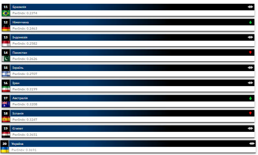 Двадцатку сильнейших армий мира замыкает Украина. Несмотря на чрезвычайную нагрузку на военную систему из-за войны со "второй армией мира", позиция украинской армии в рейтинге не ухудшилась по сравнению с 2025 годом, когда она также занимала 20 место. Для сравнения, в 2024 году ВСУ были на 18-й строчке, в 2023-м — на 15-й. Однако до полномасштабной войны Украина не попадала в 20 сильнейших армий мира.