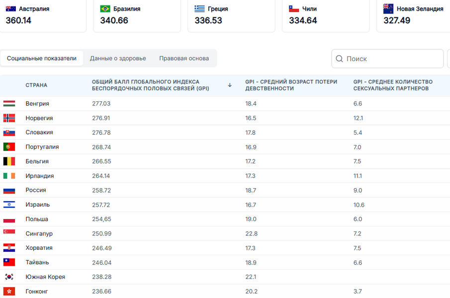 Международный аналитический портал World Population Review опубликовал обновленный рейтинг стран с самым высоким уровнем сексуальной распущенности — Most Promiscuous Countries. Это один из самых часто цитируемых мировых сравнительных рейтингов, который регулярно используют СМИ, исследователи и социологи.