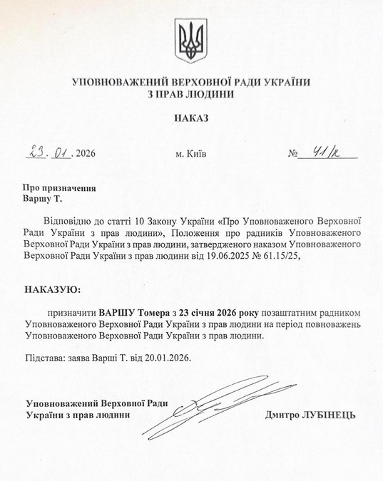 Адвокат Томер Варша официально назначен внешним советником в Израиле парламентского омбудсмена Украины по правам человека. Назначение утверждено указом Дмитрия Лубинца и вступило в силу 23 января 2026 года.