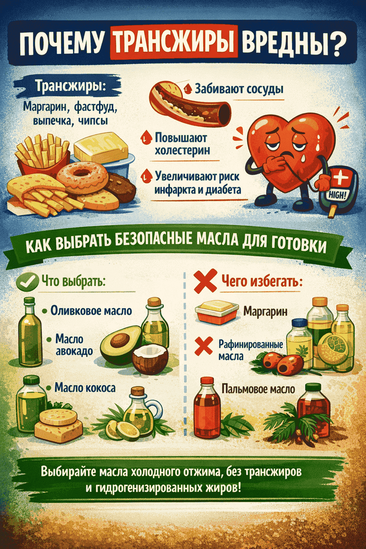 Трансжиры (ТЖК) — это ненасыщенные жирные кислоты (трансизомеры), которые добавляют в продукты при промышленной обработке, чаще всего — при производстве гидрогенизированных масел. Такие жиры не нужны человеку и считаются особенно вредными для здоровья. Они повышают уровень "плохого" холестерина LDL и снижают "хороший" (HDL), что увеличивает риск сердечных заболеваний и инсульта.