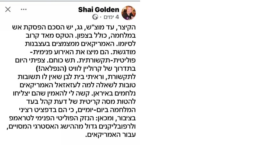 Вот Шай Голден, с того же канала, пишет в "Твиттере" в прошлую среду: "Короче, край до исхода субботы начнется перемирие, включая север. Концерт заканчивается. Американцы моргают с подчеркнутой нервозностью. Они исчерпали это дело с внутренней, политическо-медийной точки зрения. Их силы истощились. Я видел брифинг Кэролайн Ливитт (она великолепна), и я увидел Белый дом, у которого нет ответов на вопросы о том, зачем, черт побери, американцы воют в Иране. Мне трудно поверить, что они сумеют перенастроить общественное мнение в пользу войны за один-два дня, поскольку они в серьезном дефиците общественной поддержки. Отсюда следует: внутренний политический ущерб для Трампа и республиканцев выше, чем определенный стратегический выигрыш для всех американцев от войны".