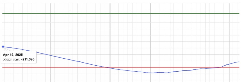 Как известно, у уровня воды в Кинерете есть три условных отметки. Уровень в -208 метров и 80 сантиметров (верхняя "красная черта") считается "полным", то есть таким, при котором Кинерет начинает выходить из берегов.