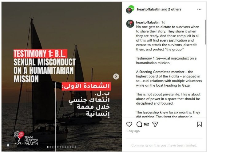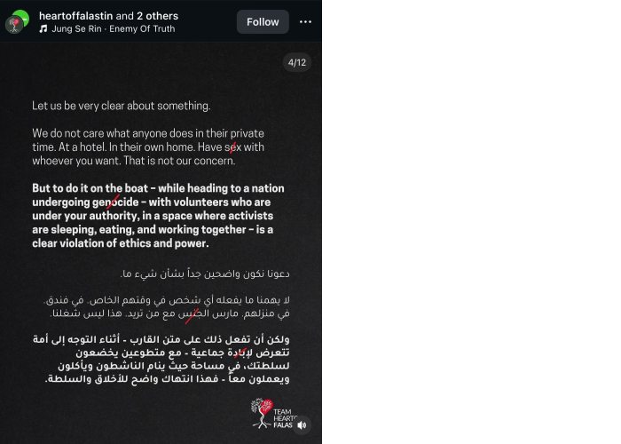 "Заниматься таким на корабле, направляясь в страну, переживающую геноцид, с добровольцами, которые вверены вашему попечительству – явное нарушение этики и злоупотребление властью,"- утверждают в "Сердце Палестины".