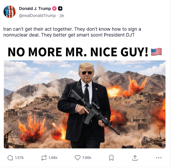 Президент США Дональд Трамп опубликовал в своей соцсети Truth Social сгенерированное искусственным интеллектом изображение, на котором он представлен с автоматом и в очках-авиаторах. На фоне - взрывающиеся объекты, предположительно, в Иране. "Больше никаких хороших парней", – гласит надпись на картинке.