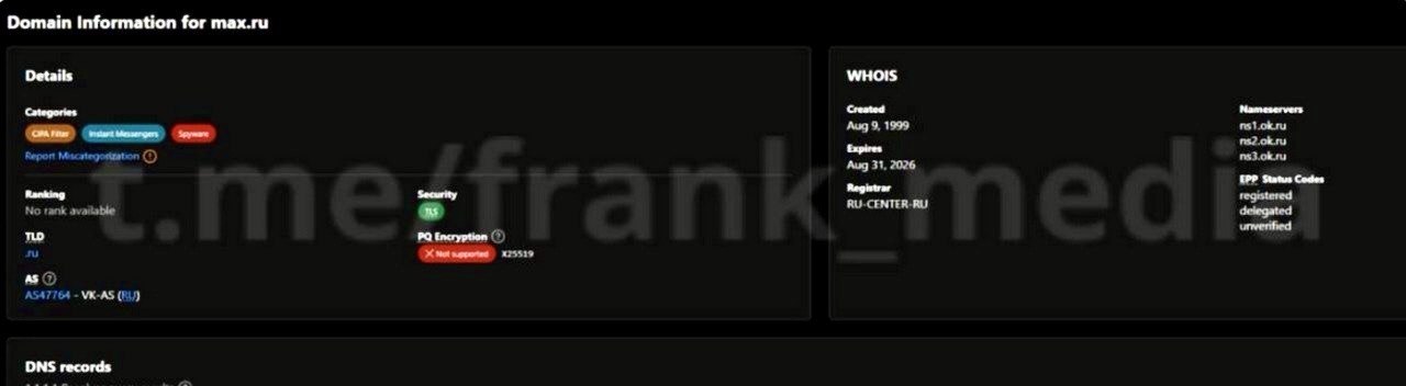 На снимке экрана – данные из системы Cloudflare по домену max.ru. В графе категорий он отмечен не только как мессенджер, но и как spyware. По сути это означает, что в инфраструктуре интернета этот сервис уже попал в класс приложений, связанных со слежкой или сбором данных.