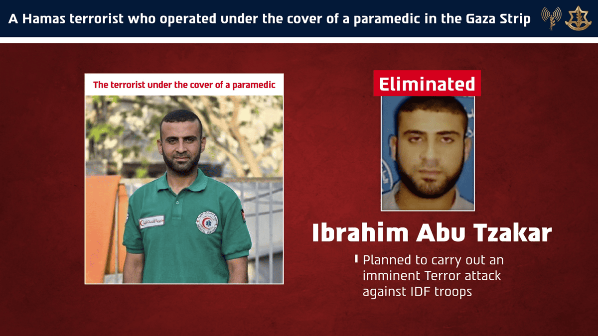 Армейская пресс-служба отмечает: Абу Цакар действовал под прикрытием службы скорой помощи, выдавая себя за фельдшера. В армии подчеркивают — такие действия ставят под угрозу медицинскую инфраструктуру и гражданское население сектора Газа.
