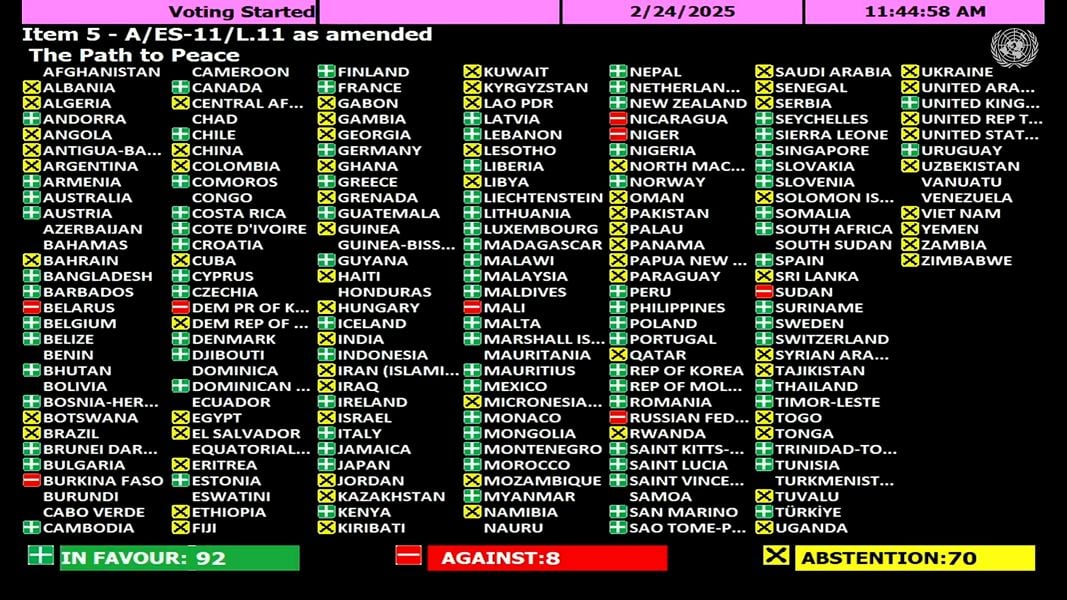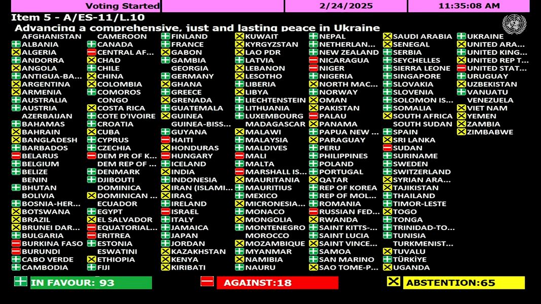 В итоге за этот вариант проголосовало 93 страны. Против украинско-европейской версии резолюции выступило уже 18 стран, среди них США, Россия, Венгрия и Израиль. 65 государств воздержались.