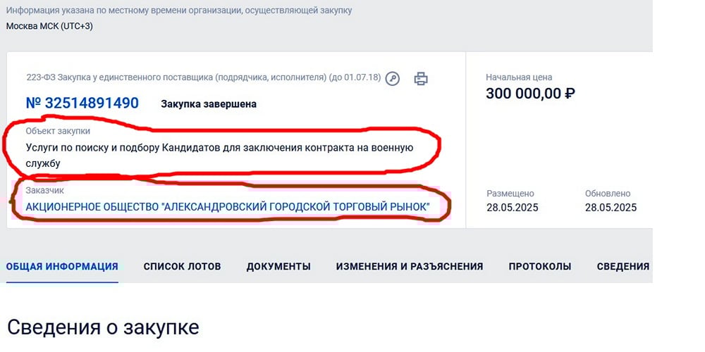 В протоколе закупочной комиссии указано, что такую сумму Александровский рынок будет платить за каждого найденного кандидата. В документе говорится, что тендер проводится "в целях поддержки проведения СВО".